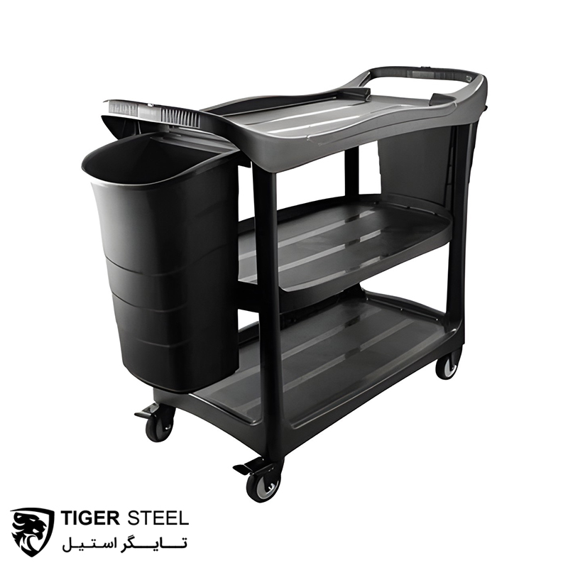 این ترولی دارای دو سطل مشکی است که برای جمع‌آوری زباله، قاشق، چنگال و سایر وسایل بسیار کاربردی است. 🗑️🍴